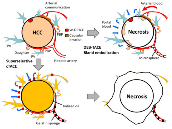 Schematic representation of rationale for superselective cTACE and DEB-TACE/bland embolization. Reproduced with permission from Ref. [33]. An Open Access article (CC BY 4.0). Abbreviations: W-D, well-differentiated; PBP, peribiliary vascular plexus, PV, portal vein.