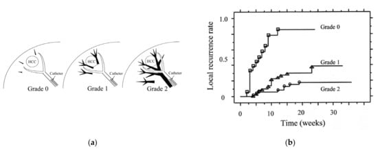 Classification of grades of portal vein visualization with iodized oil and relationship between local tumor recurrence. (a) Schematic representation of grades of portal vein visualization with iodized oil; (b) Graph shows the local recurrence rates calculated with the Kaplan-Meier method for each portal vein visualization group. The local recurrence rates for tumors in the grade 2 group were significantly lower than those for tumors in the grades 1 and 0 groups (p = 0.0485 and p < 0.0001, respectively). The local recurrence rates for tumors in the grade 1 group were also significantly lower than those in the grade 0 group (p < 0.0001). Reprinted with permission from Ref. [40].