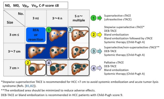 Now, we perform cTACE for almost all HCC patients with Child-Pugh scores ≤8 because it has a stronger therapeutic effect compared with other techniques. For tumors ≤7 cm and ≤3 lesions, superselective cTACE, mainly ultraselective cTACE, is performed. For tumors >7 cm but ≤3 lesions, stepwise superselective cTACE is also performed with curative intent [81,82]. Bland embolization, DEB-TACE, or systemic therapy is another option, especially for elderly patients. Bland embolization followed by cTACE is also another option to safely embolize the huge tumor [83]. For bilobar multiple lesions ≥4, superselective cTACE is not always indicated but the embolized area should be minimized to reduce liver toxicity. In this subgroup, DEB-TACE or systemic therapy is also an alternative option. For far advanced (large and bilobar) tumors, palliative cTACE, DEB-TACE, or bland embolization is indicated to aim at mass reduction or prevention of tumor rupture; however, systemic therapy is recommended first when the patient has a preserved hepatic function, although there is a risk of tumor bleeding in antiangiogenic therapy (Figure 5) [99]. In HCC patients with Child-Pugh score 9, DEB-TACE or bland embolization is recommended.