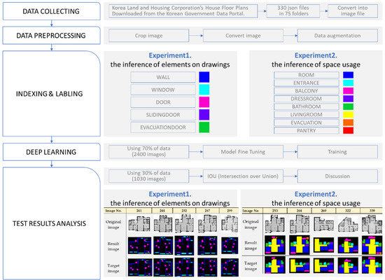 This study used DeepLabV3+ to conduct an experiment on the automatic recognition and inference of the drawing elements and space usage on architectural drawings. Given the varying purposes or sizes of buildings and the resultant differences in the composition of planes, this study was limited to apartment houses. The elements on architectural drawings were classified into five types, viz. walls, windows, hinged doors, sliding doors, and evacuation doors, and the space usage into 8 types, viz. rooms, entrances, balconies, dress rooms, bathrooms, living rooms, evacuation space, and pantries (with backgrounds excluded). The experiment process is shown in Figure 2.