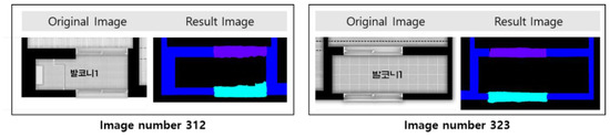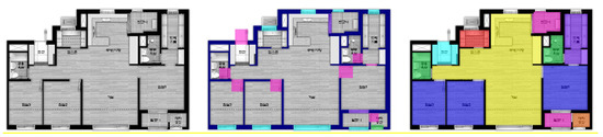 The experimental results are shown in Table 3. The notably high IOU of the EVACUATIONDOOR class is attributable to the fact that evacuation doors are represented on less than 50% of all the drawing image data for the training and test, which may have led to an absolute lack of learning, impeding the inference. Except the EVACUATIONDOOR class, the mean IOU is 0.8783. Also, in that the sliding doors are distinguished from the windows despite the difference between the two on the drawings being hardly visible to the naked eye, as shown in the figure below, the semantic segmentation allows not only the recognition of the objects in the images at the level of their semantic units, but also the detection of their spatial features. (Figure 9).