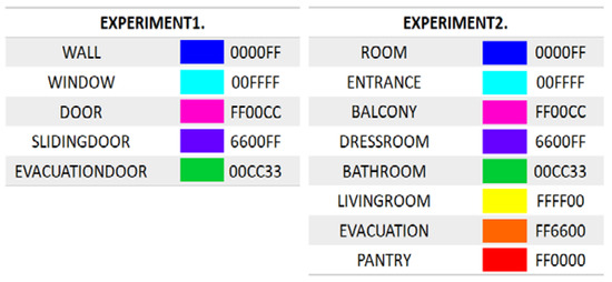 The experiment largely comprised two parts. The first part concerned the recognition of such elements as walls, doors, windows on drawings, while the second part concerned the recognition of such space as rooms, living rooms and bathrooms. The elements on architectural drawings were classified into five elements, i.e., walls, windows, hinged doors, sliding doors and evacuation doors. The space usage was classified into seven types, i.e., rooms, entrances, balconies, dress rooms, bathrooms, living rooms, evacuation space, and pantries.