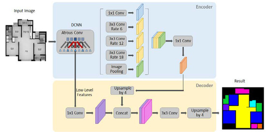 The original layer architecture of Deeplab was maintained in our implementation. In the last layer and output part of the decoder part, the class has been modified to fit 9 element recognition and 6 spatial use recognition. As input data, 2400 image files, 70% of the 3430 image data, were used for training, and 1030 data corresponding to the remaining 30% were used for testing. The training process is shown in Figure 8 [8]. In the encoder, it is first bilinearly upsampled to quadruple bilinear and then linked to the corresponding lower-level features of the network backbone with the same spatial resolution. Then, because lower-level features can contain many channels that can generally make training more difficult, another convolution is applied to lower-level features to reduce the number of channels. The feature is then reconstructed by applying several 3 × 3 convolutions, and another simple bilinear upsampling is quadrupled. The explanation for this is shown in Figure 8.