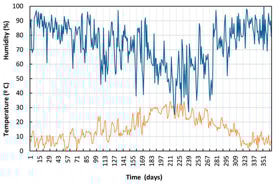 Graph of temperatures and humidity of the specimens during the shrinkage test.