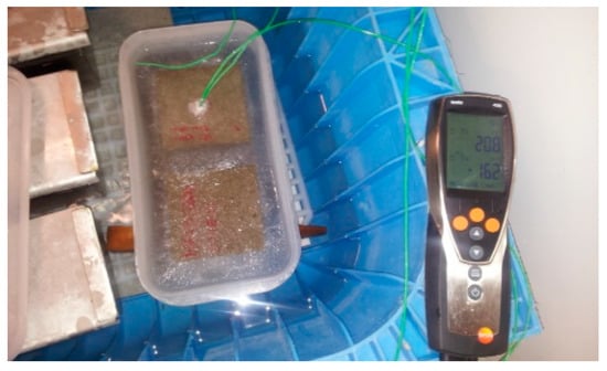 The freeze-thaw tests were done in cubic specimens of 10 × 10 × 10 cm3 and according to the UNE-EN 12390-9 [] standard, which describes the procedure to subject the test specimens to freeze-thaw cycles. The specimens were subjected for a period of 16 h to a temperature of between −13 °C to −15 °C in a freezer chest. To control the temperature inside the specimens during the test, a thermal probe was drilled and was housed inside one specimen of each series. Taking the weight of the test specimens 24 h after immersion in water as a reference, the loss of mass at 7, 14, 28, 42 and 56 cycles was determined. Tests were performed on two specimens for each mix of SCC. Figure 3 show the freeze-thaw testing equipment with temperature of the sample and the water control.