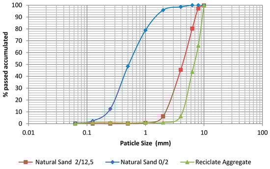 The apparent density and water absorption of the natural aggregates are shown in Table 3, while the particle size curves are shown in Figure 3. The determination of the particle size distribution of the aggregates was carried out according with the UNE-EN 933-1 standard []. The results of the RA are also shown in Table 3 and Figure 4.