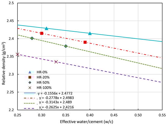 Figure 5 shows the values obtained for the different dosages as a function of the effective w/c ratio. Consistent with other studies [,] and according to Equation (3) it can be seen how the density decreases linearly as the w/c ratio increases: