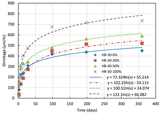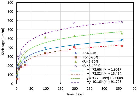 In this study, the influence of incorporation of RA on the shrinkage of the SCC has been analysed. Figure 6 and Figure 7 show the evolution of the shrinkage as function of time for the two types of concrete, HR-30 and HR-45, obtaining a logarithmic fit as in Equation (4):