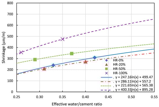 Figure 8 shows the relationship between the shrinkage of SCC, at 28 days, as a function of the effective w/c ratio. In the absence of specific literature linking these two parameters, the optimal effective fit was adapted to an increasing logarithmic curve with Equation (3).