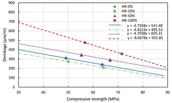 According to the studies consulted [], the relationship between compressive strength and shrinkage of concrete can be represented by a linear graph. In Figure 9 the relationship between compressive strength and SCC shrinkage with RA at 28 days can be seen. The results obtained show a decrease in shrinkage as the compressive strength increases for each type of SCC. For substitutions of up to 50%, it can be seen that the slope of the graphs hardly changes. However, for the ratio of 100% of RA, a more marked increase in shrinkage as the strength decreases is observed. These results show the influence of recycled aggregate in the paste at 28 days’ ageing.