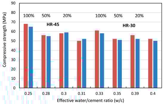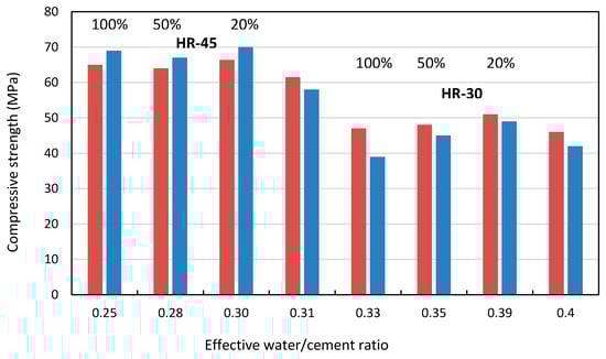 Decreases in strength for concretes with higher w/c ratios are observed, while for lower water/cement ratios, the tendency is toward increasing strength. For the higher w/c ratio (HR-30), strength losses were observed between 8% for the ratio of 20%, and 30% for the substitution of 100% RA with respect to the specimens taken as reference. However, for the dosages of HR-45, there is a slight increase in strength, between 5% and 7%, compared to the reference SCCs. In this regard, there are studies that reflect this better behavior [,]. Mulheron and Omahony [] observed that the durability of concrete made with crushed concrete and clean recycled aggregate is better or similar to the durability of concrete with natural aggregates, when subjected to freeze-thaw cycles.