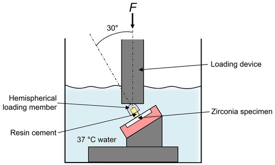 In TC tests, differential thermal changes can induce mechanical stresses and, as a result, cause crack propagation through bonded interfaces [11]. In mechanical load cycling (MLC), such crack formation and propagation seem to take place more directly, particularly when the bonded interface is brittle. Unlike TC, MLC has not been commonly used in dental research that challenges various bonded interfaces for the evaluation of bonding durability [12,13,14]. At present, however, there are no standardized MLC procedures and few studies using MLC to evaluate the adhesion durability between zirconia and resin.