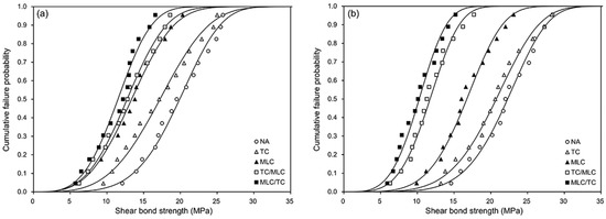 Weibull cumulative failure probability curves for the shear bond strength (SBS) values: (a) Panavia F2.0 and (b) RelyX U200.
