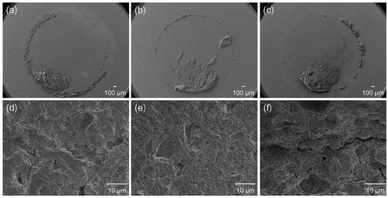 Representative SEM images of the fracture mode (RelyX U200) (magnification: upper: 30×; lower 2000×): (a) and (d): mechanical load cycling (MLC); (b) and (e): thermal cycling (TC)/MLC; (c) and (f): MLC/TC.