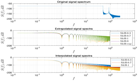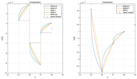 Sample and hold (S&H) systems are commonly applied in mix analog/digital systems, being the standard procedure in discrete time systems to adopt zero-order holds (S&H-0) [7,8,9,10]. The devices, are simple to construct and ‘hold’ the signal sample during one time interval. They are a basic tool of the analog to digital (A/D) conversion. In the reverse operation (D/A) other types of S&H are used. For instance, the first-order hold (S&H-1) reconstructs signals as a piecewise linear approximations and may yield better fit at the price of a higher complexity. Other S&H are the fractional- and exponential- order holds, abbreviated as S&H- and S&H-exp, with parameters and , respectively, that also improve the technique at the cost of a slight additional complexity [11,12,13,14]. In fact, we can take advantage of the extra parameter and by tuning their values for a particular application. Nonetheless, we observe the introduction of high frequency artifacts, that may pose difficulties in some applications. We can reduce this kind of distortion by using a modification of some of the above S&H systems. This change consists in introducing a delay of one sampling interval until a new sample appears. Therefore, instead of an extrapolation, as above, we are doing an interpolation [10,15]. Such procedures are very important in control [16,17] and telecommunications [9,18]. These topics are often neglected in practical applications. On one hand, the difference between theoretical and engineering implementations, due to physical restrictions, are overlooked. On the other hand, the possibilities for further improving the S&H systems, particularly when considering FC, remain to be explored.