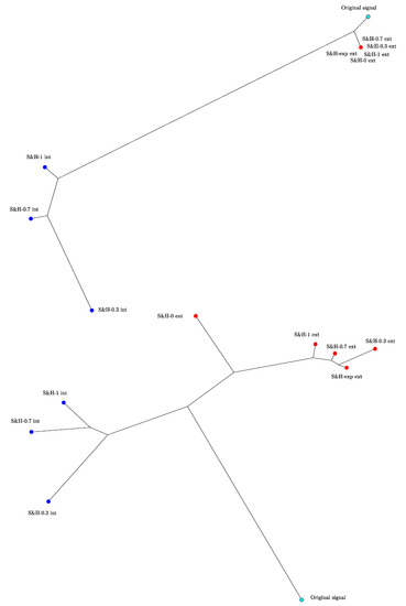 Figure 3 and Figure 4 show the HC tree and 3-dimensional MDS plots, respectively, when we compare the the frequency response of the extrapolations of the S&H-0, S&H- (with and ), S&H-1 and S&H-exp (with ) and interpolations with S&H- (with and ) and the S&H-1, using the Euclidean and Canberra distances.