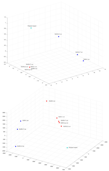 The MDS 3-dimensional plots using the Euclidean and Canberra distances, for the frequency response of the extrapolations of the S&H-0, S&H- (with and ), S&H-1 and S&H-exp (with ) and interpolations with S&H- (with and ) and the S&H-1.