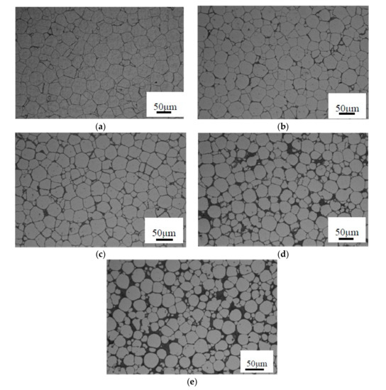 Figure 3 shows the microstructures of the composites with 1, 3, 10, 15 vol.% N-SiCp sintered at 550 °C under the compacting pressure of 4.5 GP. As shown in Figure 3a,b, Al particles without the agglomerations are uniformly coated with a small layer of the N-SiCp. There are uniform grains with a small difference and smooth grain boundaries. The particles change from a hexagon shape in Figure 3a–d to more circular shapes in Figure 3e at 4.5 GPa. Increasing the volume fraction of the N-SiCp, agglomeration appears at the boundary of the matrix in Figure 3c,d and the roundness of the Al particles increases gradually from an irregular polygon to a circular shape, as shown in Figure 3e. During the process of UHPS, the Al particle is pressed and deformed with each other. As the volume fraction of the N-SiCp increases, the N-SiCp particles surrounded by the Al particles begin to withstand the certain sintering pressure, resulting in the Al particles retaining a good roundness [20]. Besides, as the content of the N-SiCp continues to rise, the particle becomes uneven and increasingly small. During the sintering process, the pores between the particles will diffuse and migrate to the boundary of the matrix, and the small pores merge into the large pores, which make the pores disappear, and the volume of the Al particles becomes smaller.