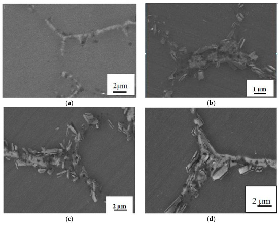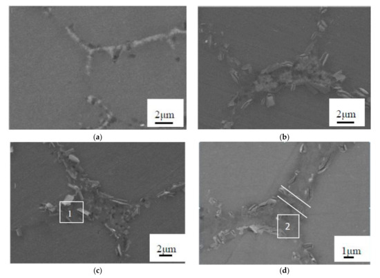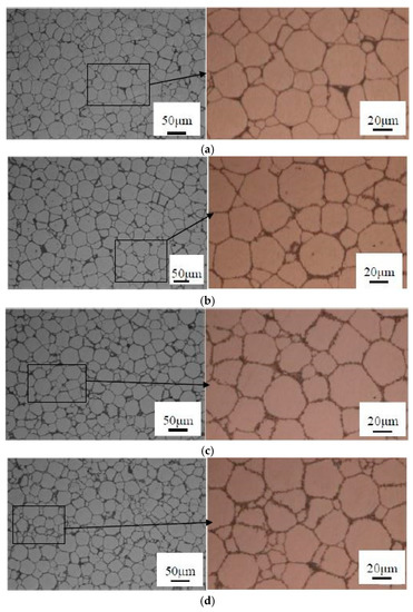Figure 8 presents the microstructure of AA6061/5 vol.% N-SiCp composites sintered at different temperatures at 4.5 GPa. It seems that, as the temperature increases, the composite has a slight agglomeration of N-SiCp. The boundary between the Al particles and the N-SiCp layer is smooth at 450 °C as indicated in Figure 8a. However, from the enlarged figure in Figure 8b–d, as the temperature rises, some glitch from the interface to the Al particles, indicating that the particles extend from the boundary to the Al particles on both sides, which makes the boundary rough. Additionally, an increasing number of small size particles could be inspected. Because of the low temperature, there are a large number of connected pores between the Al particles or between the N-SiCp, and between the Al particle and N-SiCp. These small pores could diffuse on the sample surface. Due to the continuous reduction and disappearance, the micropores begin to increase, and the similar small pores can be merged by the micropores. This will contribute to the reduction in the total pores and the volume fraction of the composite, as well as the increases in the density. As the temperature further increases, the pore surface becomes smooth and begins to round, but the pores do not reduce or disappear. At this time, under the action of the pressure, the pores move toward the surface of the Al particles, and the atoms in the Al particles move in the opposite direction. The pores are filled and grown into smaller Al particles, illustrating the increment of small-sized particles in the metallographic photograph.