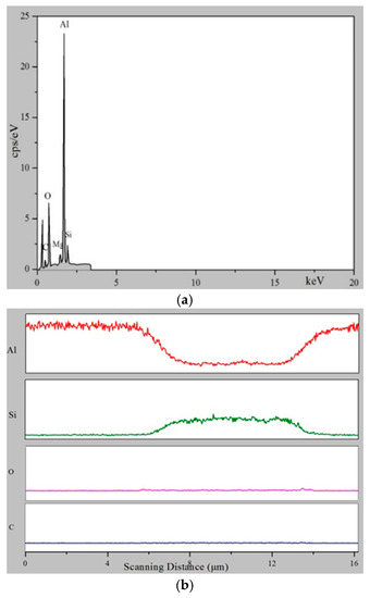 EDS-SEM analysis: (a) The analysis of point 1 of AA6061/10 vol.% N-SiC, (b) The analysis of line scanning 2 of AA6061/15 vol.% N-SiC sintered at 550 °C.