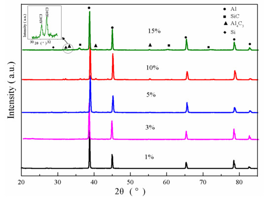 To further determine the composition of the phase, X-ray diffraction was used to examine the constituents of the AA6061/N-SiCp composites with different volume fractions of N-SiCp, as shown in Figure 6. With the increase in SiCp content, the peak intensity of SiC gradually increases at 32°. For AA6061/5 vol.% N-SiCp, the two main peaks of the Al4C3 phase are detected at 2θ of 31°~32° while the peak is not detected for the sample with 1 or 3 vol.% N-SiCp. Combined with the SEM micrograph of AA6061/3 vol.% N-SiCp, a short rod-like phase appears at a certain position. The larger volume fraction of N-SiCp content is, the more N-SiCp around the Al particles, and the larger the interface surface exists between N-SiCp and Al particles. Moreover, the probability of reaction will increase, resulting in more product.