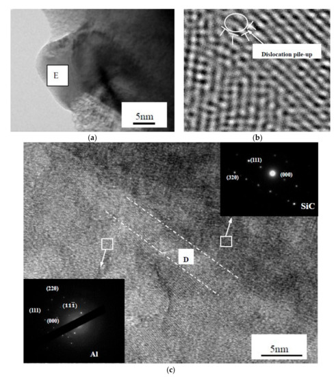 Figure 7a shows the TEM micrographs of AA6061/1 vol.% N-SiCp. Figure 7b shows the high-resolution microstructure of the interface in Figure 7a. The dark gray ellipsoidal particles in Figure 7a are N-SiC particles with a size of 50 nm, and the white edge is the Al matrix. The interface of the AA6061/1 vol.% N-SiCp is clean and combined tightly and continuously. Figure 7c shows an inverse Fourier transform diagram of the high-resolution map of the C region in Figure 8b. There are many dislocations near the N-SiCp interface. There usually exist thermal misfit dislocations at the interface due to the difference in the thermal expansion coefficient during sintering and cooling. Miller and Humphrey [21] derived the formula of the dislocation density increment for the ideal cubic shape reinforcement particle composite:
