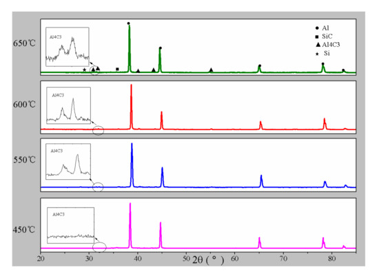 XRD patterns of AA6061/5 vol.% N-SiCp sintered at different temperatures: 450, 550, 600, and 650 °C.