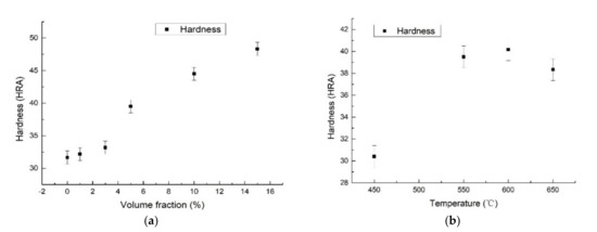 The curve of the hardness of AA6061/N-SiCp composite at 4.5 GPa: Relationship between hardness and volume fraction: 0, 1, 3, 5, 10, 15 vol.% (a), Relationship between hardness and sintering temperature: 450, 550, 600, 650 °C (b) for AA6061/5 vol.% N-SiCp sample.