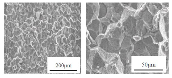 Some of the literature [27,28,29,30,31,32] studied the tensile strength of Al/N-SiCp composites with the different content of SiCp. In this paper, AA6061/N-SiCp composites with 3, 5, and 10 vol.% were prepared at 550 °C. It showed the largest tensile strength of the composite, 314.7 MPa for AA6061/3 vol.% N-SiCp without further treatment. Compared with the AA6061/N-SiCp prepared by powder metallurgy at 600 °C, the tensile strength increased by about 88.2%. The fracture morphology is shown in Figure 13. The surface of the port has a stone-like fracture morphology, which is due to the dispersion of N-SiCp at the grain boundary. The dispersion of N-SiCp forms a large number of fine dimples distributed along the grain boundary. The N-SiCp location is inclined to cause stress concentration, and thus the crack is easy to form at the grain boundary and expands along the grain boundary, resulting in brittle grain boundary fracture. Therefore, the fracture mechanism is an intergranular fracture.