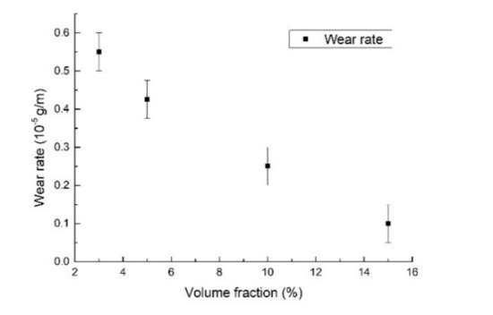 Figure 15 shows that the wear rate of the AA6061/N-SiCp composite decreases gradually with the increase in the volume fraction of the N-SiC particles. When N-SiCp increases from 3 vol.% to 15 vol.%, the wear rate decreases from 0.55 × 10−5 g/m to 0.1 × 10−5 g/m, indicating the wear resistance is improved. This is consistent with the conclusions reported by Zhang et al. [36], who studied the dry sliding friction and wear properties of AA2009/20 vol% SiCp.