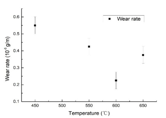 - The hardness and wear property first increase and then decrease as the temperature increases. The hardness reaches up to 52 HRA, and the wear rate is just 1.0 × 10−6 g/m at 600 °C. The wear mechanism is mainly composed of abrasive wear and adhesive wear.