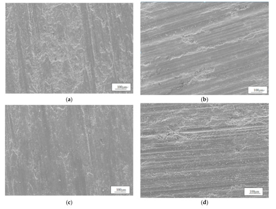 For AA6061/15 vol.% N-SiCp, the wear rate is only 0.1 × 10−5 g/m. In the meantime, the wear model exhibits mainly fatigue wear, as shown in Figure 16d. Slight scratches and fatigue cracks can be inspected on the surface. For the high content of AA6061/N-SiCp, the surface hardness is high. The periodic load during the wear process causes the subsurface layer to plastically deform, bulge, and generate fatigue cracks. The excessive interface will also reduce the bonding strength, and the convex portion will be crushed to form wear debris. At this time, the abrasive chips are mainly composite particles of N-SiCp and Al particles, and the roundness is good. It is different from the polygonal micro-SiC cutting into the Al substrate. The bonding of the Al substrate and the grinding disc is appropriate, resulting in the enhancement of the wear resistance. The AA6061/N-SiCp composites have a very small size of N-SiCp, and the surface damage is less after the formation of abrasive chips; therefore, it is suggested that the wear resistance is better.