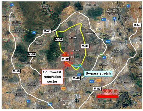 Madrid is surrounded by three ring roads (M-30, M-40, and M-50), Figure 1. The M-30 is the busiest one and that which passes closest to the city center, contributing 24.2% of the metropolitan area daily traffic and 9.4% of that of the greater Madrid region, with an average annual daily traffic about 200,000 vehicles/day [8]. Its total length is about 32 km, with a generic configuration of 3 + 3 lanes except on the north part where it is an urban boulevard [1].