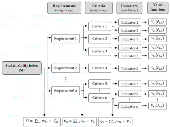 Structure of a generic modelo integrado de valor para una evaluación sostenible (MIVES) decision tree (modified from [40], Copyright CIMNE, 2016.).