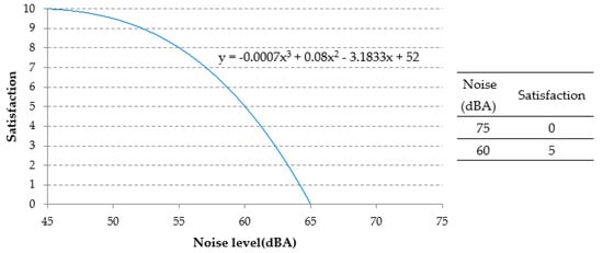 - Environmental requirements: from the environmental point of view, function values of the material consumption at construction time (C6, Table 1) follow a similar trend to C1 and C3 (total costs and dismantling, Table 1 and Table 2). Again, it could be assumed that non-modification of the road implies that no materials are used and then the impact of this factor is zero. By contrast, the burial of the M-30 involved consumption of several building materials, especially concrete which is made up by water, cement, aggregates, chemical additions and, in the case of reinforced structures, steel [73]. The environmental impact of the extraction, production and transport of these raw materials has been evaluated as a medium impact (I9-I13, Table 2). However, this impact increases when considering greener and improved materials; for example, high-strength concrete requires low water cement/ratios and high-strength aggregates [74,75]. That means that the consumption of cement will rise and, consequently, so will its environmental impact. Equally, the use of high-strength aggregates can raise the costs and environmental impact of the exploitation and transport of these materials, with it being the least sustainable alternative from the point of view of the environmental aspects during construction. It should also be mentioned that the trend of the function value concerning the use of recycled materials is different from that explained before (I14, Table 2). Non-recycled materials were used during the construction of the old and new layout. However, the third alternative considers the use of recycled materials as greener building materials, enhancing the sustainability of this indicator (Table 2). Moreover, the use of greener and improved materials such as high-performance or self-compacting concretes, improves the durability characteristics of the infrastructure, decreasing the number and scope of maintenance operations and extending its service life [76,77]. Thus, such an alternative is the most suitable (C6, Table 2).Additionally, one of the aims of the renovation of the M-30 was to increase the capacity of the road and improve traffic flow [9]. Such improvement and the burial of the former layout were also responsible for the enhancement of environmental indicators in the area (C9, C10, Table 2). It may be observed that the emissions of noise and pollutants increased during the construction works of the M-30 (C8, Table 2). However, once the works were finished, the environmental benefits produced by the renovation of the road were easily recognized (Table 2). For example, as shown in Figure 3, before the construction of the tunnels (2006), in the district of Arganzuela (Figure 1) which is located in the south-west sector of the M-30, the noise level was above 75 dBA. By contrast, in 2011, it was generally about 60 dBA except at the entrances and exits from the tunnels, where it was higher [10]. Spanish law [70] limits the noise levels to 65 dBA in residential areas. Therefore, the score obtained with the function value will be 0 if this limit is exceeded. Considering 45 dBA as an acceptable noise level (satisfaction value 10), the function value will exhibit a decreasing concave curve, where satisfaction will drop rapidly when approaching the point of minimum satisfaction (Figure 3, [22]). It is remarkable that the burial of the M-30 and the construction of the tunnels led to a reduction of noise pollution of the area [10]. However, although noise levels were lower after the works than before them, the value of the recovery has been considered medium (I28, Table 2) given that the increase of the traffic, especially in the access to the tunnels, has raised the noise disturbance in the area [10].