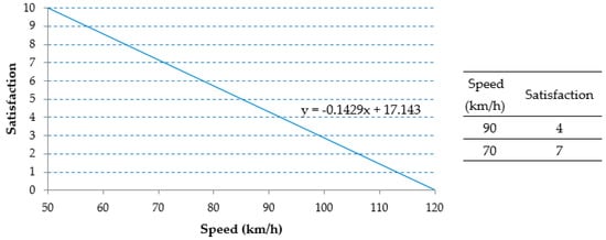 The same situation occurs with pollutant emission indicators (Table 2). Although emissions are lower than before the construction of the tunnels [10], they remain higher than the annual medium limit established by Spanish law for NOx gases (40 μg/m3, [78]). It should be mentioned that these emissions have also been reduced by the speed limit applied to the road, due to safety reasons, from 90 km/h to 70 km/h [1]. It has been shown that application of speed limits is an effective way to reduce vehicle emissions [79,80,81]. In particular, reducing it from 90 km/h to 70 km/h leads to a 15% and 16% reduction in CO2 and NOx emissions, respectively, on the M-30 (although emissions during peak hours may be increased) [1,79,80]. Therefore, given that speed limits in Spain range from 50 km/h to 120 km/h, the indicator can be assessed for the speed limit dependent emissions function (I19, Table 2) the value 0 when speed limit is 120 km/h (as it will provide higher emissions) and the value 10 when speed limit is 50 km/h. With a decreasing lineal function, as shown in Figure 4, the scores for the indicator at 90 km/h (before the construction of the tunnels) and 70 km/h (after the construction of the tunnels) are obtained. However, it must be noticed that these values of the function are only evaluating pollutant emissions depending on speed limits, as it is known that an excessive reduction of the speed limits will have negative impact on travel times and traffic fluency [1].