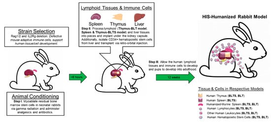 Illustration of the construction of the human immune system (HIS)-humanized rabbit models. First, immunodeficient rabbits, for example the ones with defects in recombination activating gene 1/2 (Rag1/2) and interleukin 2 receptor subunit gamma (IL2Rg), are developed and myoablated via gamma irradiation or busulfan, followed by the administration of antibiotics and analgesics at 1 to 2 weeks after birth. Second, to generate human lymphoid tissue xenografts along with autologous immune cell reconstitution in the rabbits, human fetal lymphoid tissue(s) and liver are processed into 1 mm3 pieces, and autologous CD34+ hematopoietic stem cells (HSCs) are isolated from the fetal liver via immunomagnetic selection of CD34+ cells. CD34+ HSCs are then transplanted into the neonatal rabbit via intrahepatic injection following renal capsule transplantation of the lymphoid tissues. Third, the transplanted rabbit is maintained under specific pathogen-free conditions and the lymphoid tissue(s), and/or immune cell reconstitution in the peripheral blood, are allowed to develop over a period of 3 months, resulting in the HIS-humanized rabbit model. BLTS: bone marrow stem cells, liver, thymus, and spleen. BLT: bone marrow stem cells, liver, and thymus.