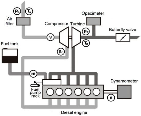 The diesel engine test configuration. Sensors: m—mass flowmeter; n—tachometer; p—manometer; T—thermometer; and V—volumetric flowmeter.