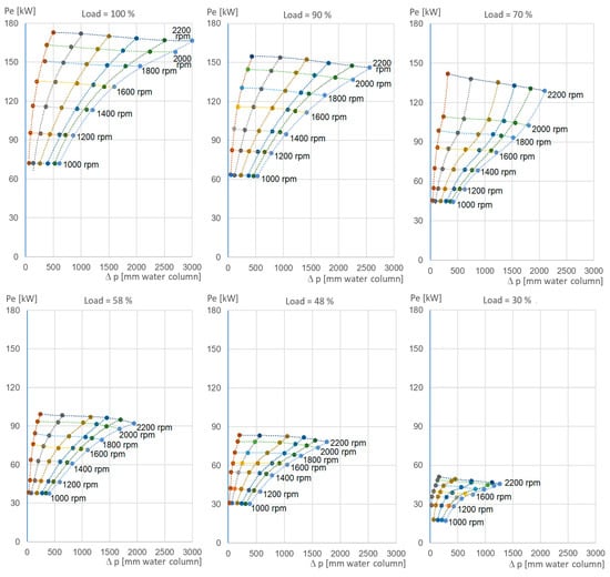 The six EBPs values were adjusted for the engine rated speed of 2200 rpm and full load; lower EBPs resulted in lower engine speeds and loads. Finally, for each of 42 distinct engine operation modes, 6 steps of simulated exhaust back pressure were applied, resulting 42 × 6 = 252 points. For the smallest load (30%) and the highest exhaust back pressure (3000 mmWC), the measurement of parameters at all the seven speeds was not possible due to the construction of the exhaust throttle valve, so the number of operation points was 246.