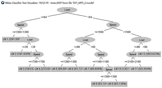 The evaluated classifier tree (applied to the engine test-bench dataset), belonging to a fifth category (in reference to the above-mentioned type 3 and 4 algorithms) builds a model (M) via a “divide et impera” procedure, presented in Figure 5. We chose the optimized M5 method (M5P, or the M5 method that has been “pruned” or “trimmed”) that starts with a preliminary data sub-domain division and then applies the linear M5 model to each such sub-domain. The M5P alternatives offered by WEKA included RandomTree (random successive approximation of the tree), RandomForest (random combination of trees), and RepTree (repetitive combination of several trees).