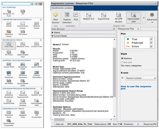 Performance of the AI cloud model suggested by MATLAB and Pe predictions vs. test values plot (to the right the predicted Pe values are plotted together with the values of the test data set, an intuitive illustration of the GPR algorithm’s performance).