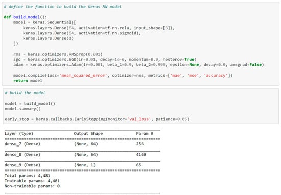 Figure 7 shows the Keras NN build-up. Each of the two “dense” layers of the ANN had 64 neurons, so, for the three inputs, there were 3 (+1 for the bias) multiplied by 64 = 256 weights for the first layer; for the second layer, there were (64 + 1) × 64 = 4160 weights; and, for the output neuron 64 + 1 = 65 weights, so the total was 256 + 4160 + 65 = 4481 coefficients.