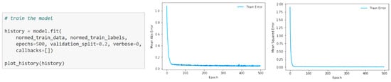 The last phase of this Keras flow was the running of the training process depicted in Figure 8. For this purpose, the fit method was invoked for the above-configured model. Five-hundred iteration epochs were ordered (using an own validation_split = 0.2, i.e., 20% out of the normed_train_data).
