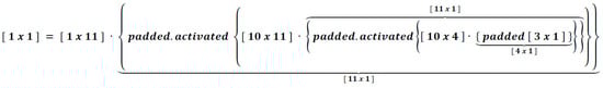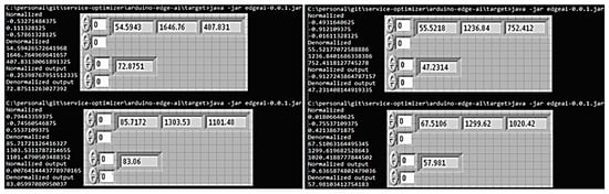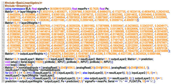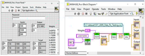 As shown in the diagram of Figure A5, the preliminary calculus provides the normalized_input = (input − mean)/standard_deviation. A transposition is then followed by the first padding (“bordering”), with a simple 1 element of the normalized_inputs column vector to enable its matrix multiplication with the above-mentioned already padded “layer1Weights” array (read from the Weights1_Bias1.csv file). Similar matrix computations are performed at the second layer and at the output. Each of the ReLU activations at the first and second hidden layers is implemented with a For Loop that individually checks all corresponding neurons outputs and, if negative, replaces them with 0 as elements in an array subset enclosed in a case structure. Finally, after reading the reference Pe parameters (as .csv files containing results of the statistic computation performed not on testing but on the training data, as emphasized before), the denormalized_output = output_mean + normalized_output ∗ output_standard_deviation is calculated.