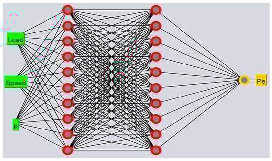 For edge AI solutions, the chosen method was SGD (stochastic gradient descent), which computes a new modification of each ANN weight as a linear combination of the previous modification (its coefficient being the so-called “momentum”) and of the gradient itself (its coefficient being the “learning rate”). In our case, the ANN inputs were load (L), speed (S), and EBP (p), and the output was the effective power (Pe).