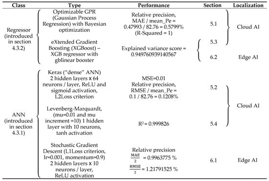 As already mentioned, processing and storage resources in the cloud could be considered “infinite” for our approach, and only communications could theoretically limit the performance of an edge–cloud–edge vehicular smart device implementation. In the following paragraphs, we detail the methods (mainly regressors and ANNs) used for running AI algorithms in the cloud for the common parameters and test-bench datasets introduced in Section 3 and detailed in Appendix A.