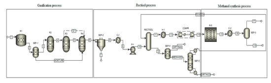 The main purpose of Rectisol is to clean up the outlet syngas of gasification to obtain a high-quality syngas that can be used for the methanol synthesis []. The Rectisol process uses chilled methanol as the solvent to remove the major impurities, such as CO2, H2S, COS, CS2, and HCN, producing a cleaner syngas. Thus, the Rectisol system is able to obtain a pure syngas stream and simultaneously adjust its stoichiometric ratio to satisfy the requirements of methanol synthesis. In addition, the methanol used in the purification step can be reused over several cycles, making the process economically feasible.