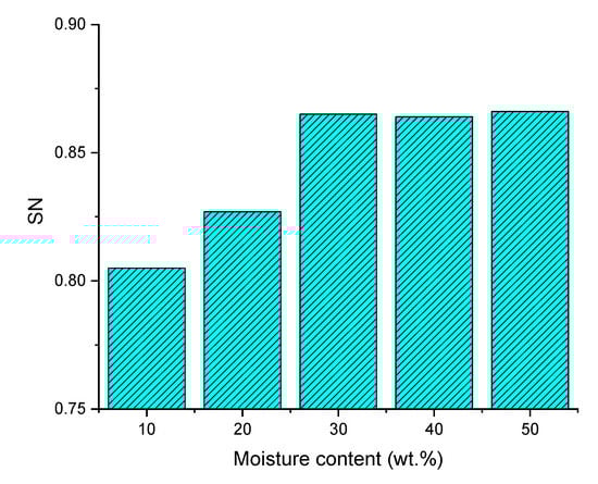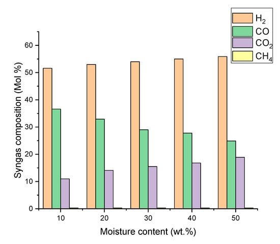 Figure 4 and Figure 5 present the effects of pyrolysis oil moisture content on syngas composition and SN between 10 wt.% and 50 wt.%. According to water gas shift reaction (R-7) and water gas reaction (R-6), moisture content in pyrolysis oil increases the mole fraction of H2 and CO2, while the amount of CO decreased. As a result, the SN value constantly increased from 0.805 to 0.865 with the pyrolysis oil moisture content from 10 wt.% to 30 wt.%. When the moisture content is more than 30 wt.%, the H2 and CO2 concentrations continually increase while the CO decreases and the SN value is maintained at 0.865. Therefore, the moisture content in pyrolysis oil seems to be the most beneficial around 30% because excess moisture content has no positive effect on syngas composition and SN value. In contrast, it will consume more heat during gasification process. The effect of pyrolysis oil moisture content on syngas SN value is also similar to Van Rossum experimental research []. In this study, beech oil is used to produce syngas through gasification, and the steam/carbon ratio is increased from 2.1 to 3.2, resulting in an increase in the syngas SN value from 0.566 to 0.692.