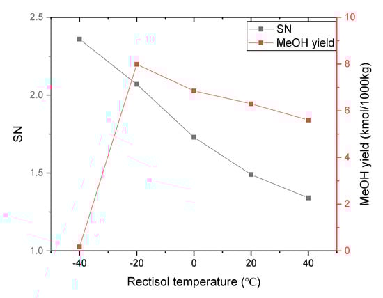 As indicated in Figure 3 and Figure 5, the SN of syngas produced from gasification is so low that it cannot satisfy the requirement of methanol synthesis. Therefore, a syngas post-treatment process like Rectisol is needed to adjust its composition. Figure 6 shows the effect of Rectisol temperature on syngas composition, SN, and methanol yield. As is well known, the solubility of methanol to absorb CO2 gradually decreases while the Rectisol temperature increases []. When the Rectisol temperature decreases from 40 °C to −40 °C, the content of CO2 remaining in the syngas decreases from 6.175 kmol to 0.013 kmol. As a result, the SN continues to increase from 1.34 to 2.36 with the decrease of the Rectisol temperature. As Figure 7 indicated, when the temperature of Rectisol was −20 °C, the SN value was close to 2. At this point, the methanol yield reached the maximum of 7.99 kmol. When the Rectisol temperature was below −20 °C, the methanol yield decreased dramatically along with the decrease of Rectisol temperature. This is caused by the low content of CO2 in syngas to react with H2 to synthesize methanol. When the Rectisol temperature is higher than −20 °C, the methanol yield is also reduced due to excessive CO2 in syngas that cannot satisfy SN requirement.