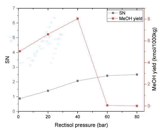 Effect of Rectisol pressure on SN and methanol yield (−20 °C).